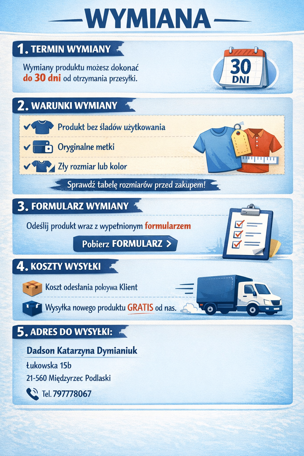 - Wysyłka nowego produktu w odpowiednim rozmiarze jest bezpłatna i pokrywa ją sklep Dadson.